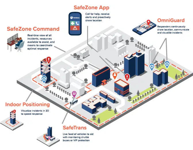 SafeZone also enables organizations to integrate a wide range of potential responders to optimize response to any situation through communication and visualization of specific groups of first responders, specialists, volunteers, outside agencies and end users based on their real-time location, role, and the nature of the situation.